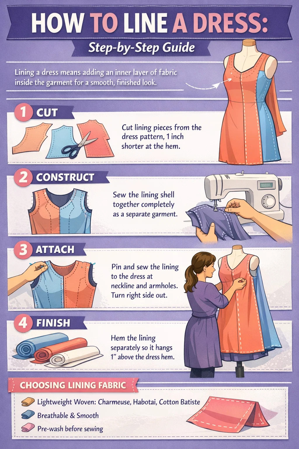 Useimmissa tapauksissa leikkaat vuorin samoista kuviopaloista kuin mekko. On kuitenkin kourallinen tärkeitä säätöjä, jotka estävät vuorauksen näkymisen helman alla tai luomasta vetoviivoja vartalon poikki.