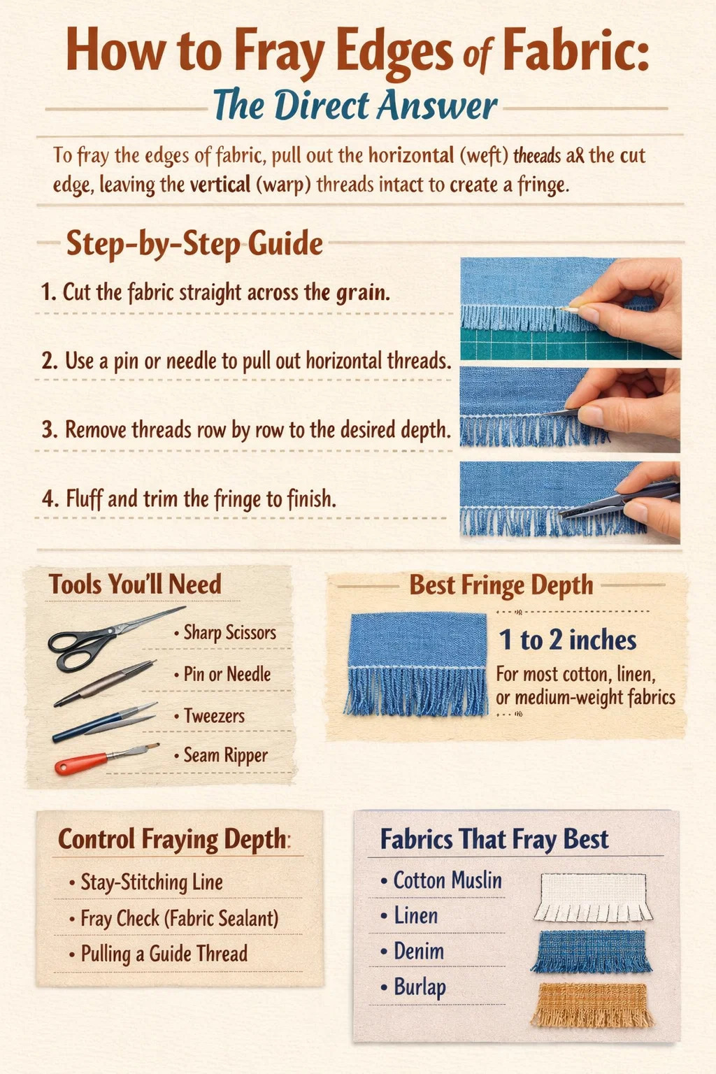 Fray Check on nestemäinen saumatiiviste, joka liimaa langat yhteen levitettäessä ja kuivuu kirkkaaksi ja joustavaksi. Levitä ohut viiva Fray Checkia viivalle, johon haluat hankauksen loppuvan, anna sen kuivua kokonaan (yleensä 10-15 minuuttia ) ja ala sitten vetää lankoja leikatusta reunasta kohti suljettua linjaa. Liimatut langat eivät irtoa tämän pisteen jälkeen.
