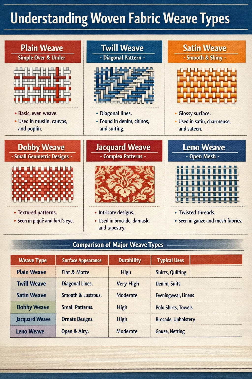 | Dobby Weave | Pieni geometrinen rakenne | Korkea | Poolopaidat, pyyhkeet, mekkopaidat |
