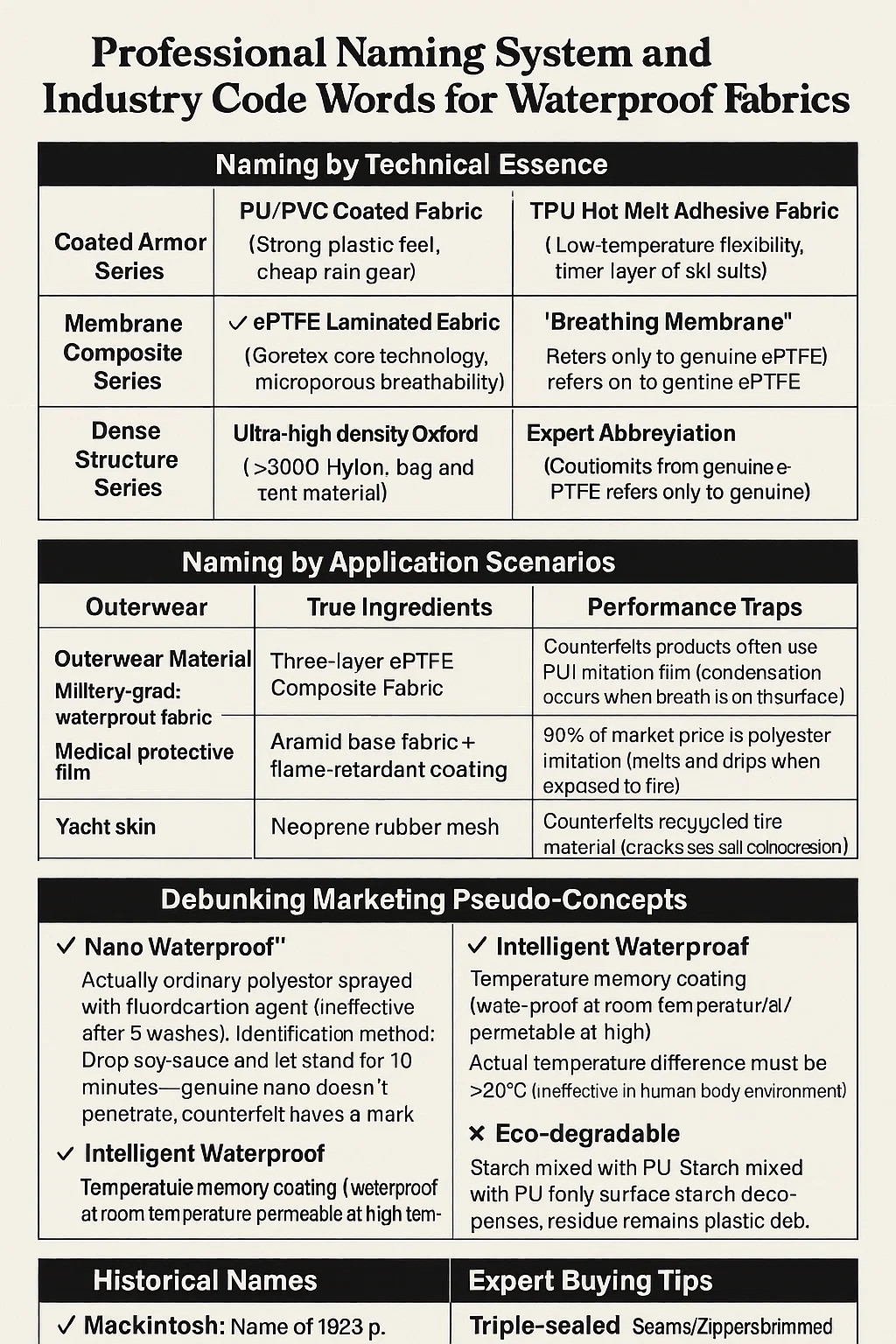 Ammattimainen nimitysjärjestelmä ja teollisuuden koodisanat Vedenpitävät kankaat
