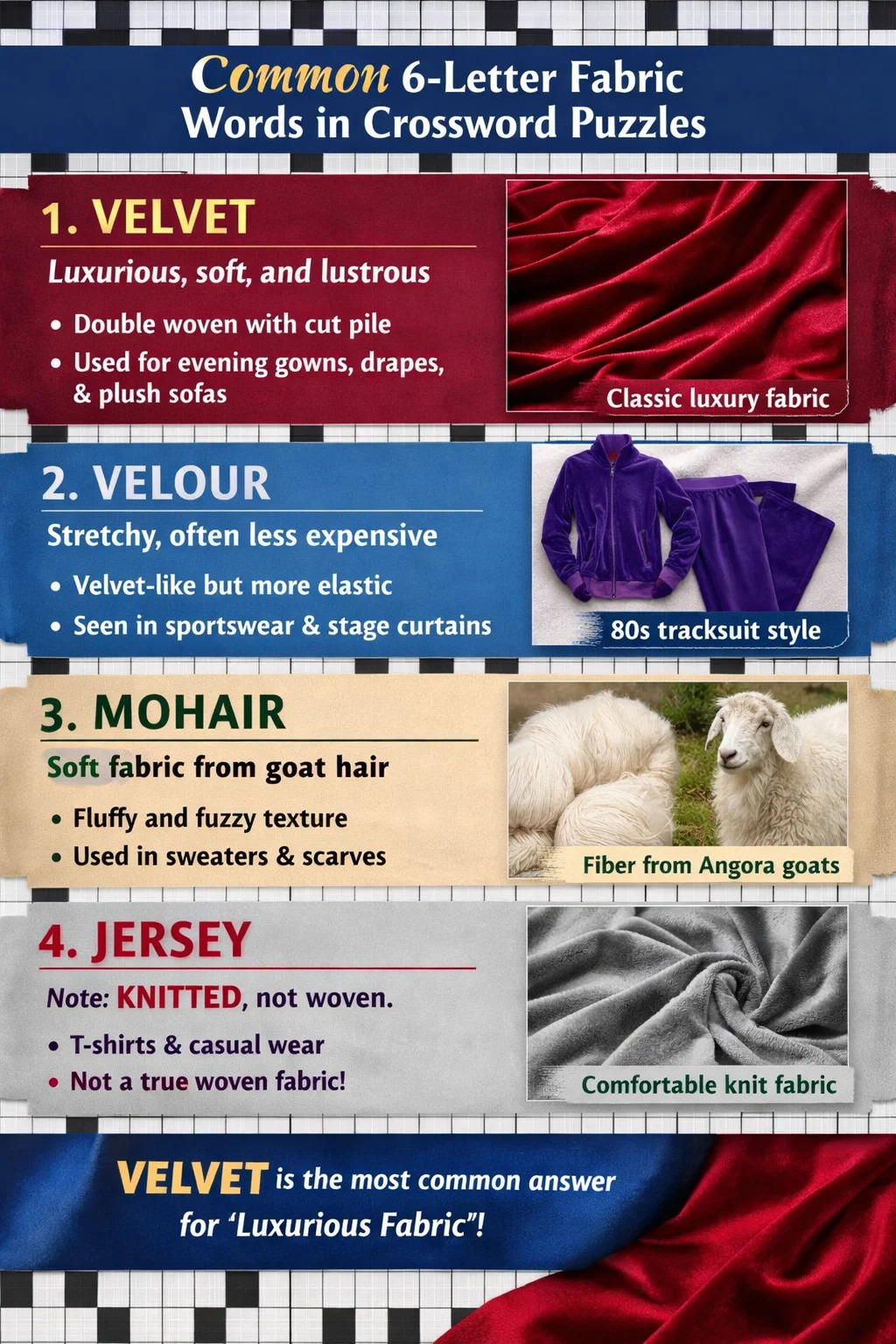 Ristisanatehtävässä, jos vihje kuvaa "ylellistä, pehmeää ja samettista" 6-kirjaimista kudottu kangas , klassisin vastaus on VELVET.