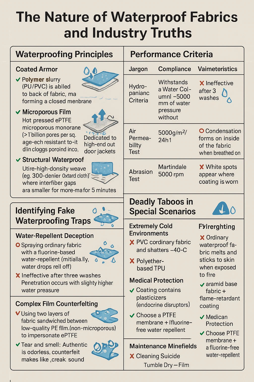 Monimutkainen kalvon väärentäminen: Kahden kangaskerroksen käyttäminen heikkolaatuisen PE-kalvon välissä (ei-mikrohuokoinen) jäljittelemään ePTFE:tä. ** Repeämä ja haju: Authentic on hajuton, väärennös haisee dieseliltä. ** Hiero ja kuuntele: Autenttisesta kuuluu "huinaavaa" ääntä, väärennöksestä "natisee".