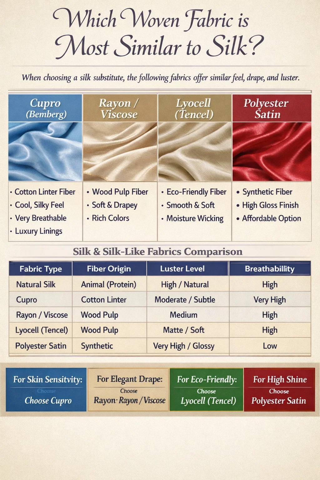 Kun etsit a kudottu kangas joka jäljittelee luonnollisen silkin ylellistä tunnetta, kiiltoa ja verhoilua, merkittävimmät kilpailijat ovat Rayon, Cupro ja Lyocell (Tencel) . Näiden joukossa Cuproa pidetään laajalti lähimpänä otteluna hengittävyyden ja silkkisen kosketuksen suhteen Satiinikudottu polyesteri toimii yleisimpänä edullisena synteettisenä vaihtoehtona. Nämä kankaat käyttävät erityisiä kudonta tekniikoita, jotka jäljittelevät silkkiäistoukkien tuottamia sileitä proteiinikuituja.
